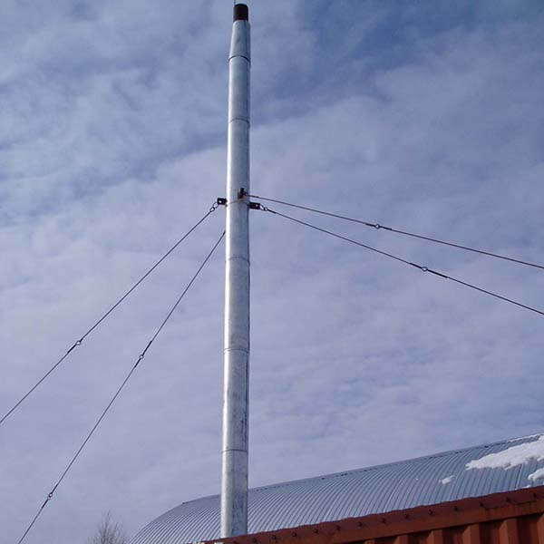 Дымовые трубы на растяжках, как и другие дымовые трубы, используются для отведения продуктов сгорания. Ключевая особенность использования труб на растяжках – это простота перевозки и монтажа конструкции. Секции труб соединяются между собой непосредственно на территории объекта во время монтажа. Дымовые трубы на растяжках могут достигать высоты в 31 метр, благодаря растяжкам даже такие высокие конструкции очень устойчивы. Дымовые трубы на растяжках допускается устанавливать в районах с сейсмической активностью до 6 балов. Помимо самих дымовых труб в конструкцию входят газоотводящие стволы, которые подводятся к главным стволам. В зависимости от условий работы при производстве дымовых труб иногда используют термоизолирующий слой. Максимально допустимая температура газообразных продуктов горения составляет 350 градусов Цельсия. Также мы изготавливаем мачтовые дымовые трубы.